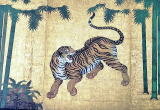 塔頭寺院の天球院(普段は拝観できない寺院)では、重要文化財の障壁画の数々を見せていただきました。写真は、いただいた絵葉書からのものです。虎の間の一部です。  |